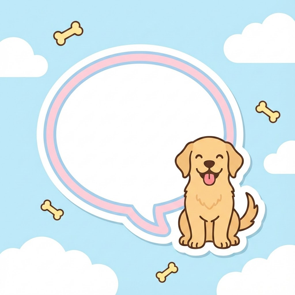 A single, high-quality kawaii memo sticker design. A large, blank, white speech bubble or text box occupies the center, outlined with a soft colored border. Beside the bubble, there is a charming golden retriever puppy in a sitting with its tongue out happily pose. The background is a soft sky blue with white fluffy clouds, adorned with small, cute yellow bone icons. Flat illustration style, clean outlines, soft pastel color palette, minimalist aesthetic. Aspect Ratio 1:1.