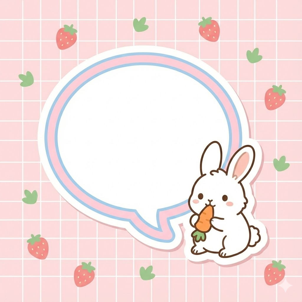 A single, high-quality kawaii memo sticker design. A large, blank, white speech bubble or text box occupies the center, outlined with a soft colored border. Beside the bubble, there is a charming snow-white fluffy rabbit in a nibbling on a small carrot pose. The background is a soft pale pink with a fine grid pattern, adorned with small, cute strawberry and leaf shapes. Flat illustration style, clean outlines, soft pastel color palette, minimalist aesthetic. Aspect Ratio 1:1.