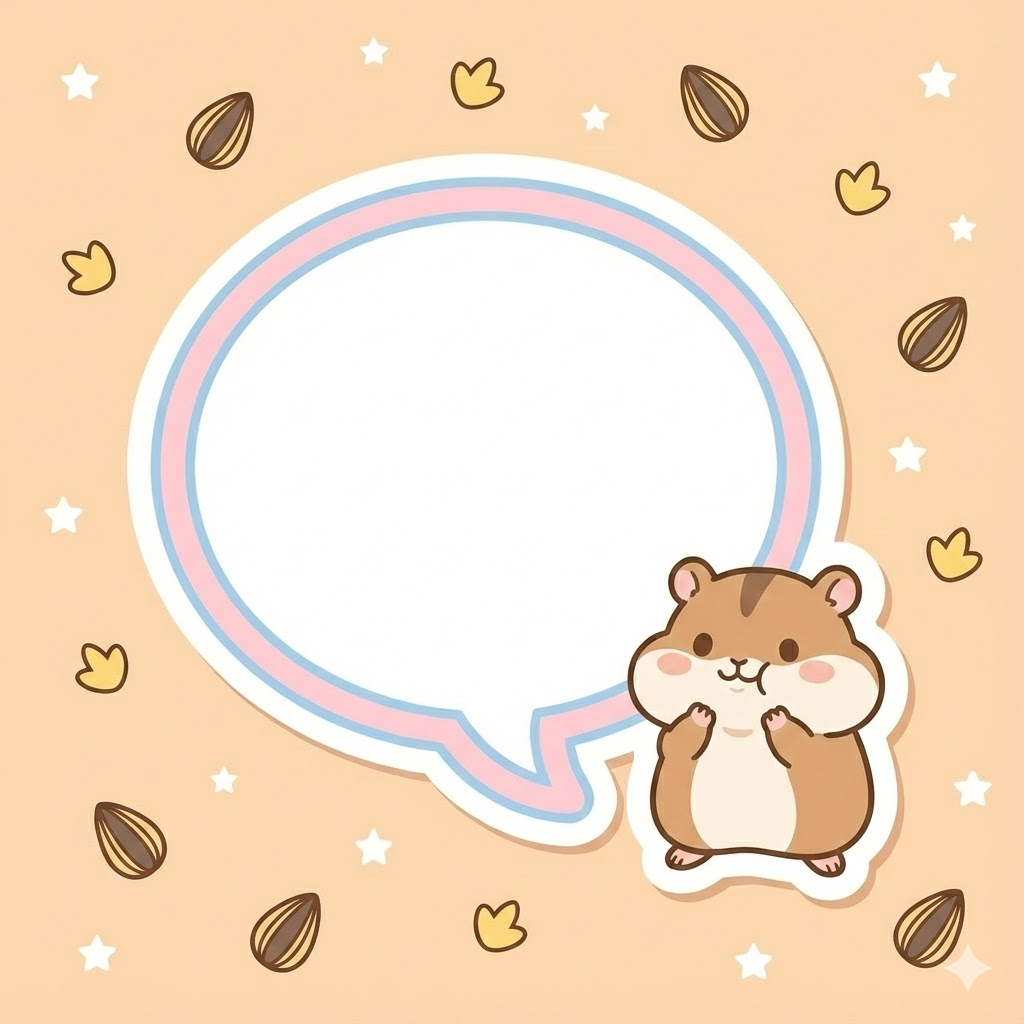 A single, high-quality kawaii memo sticker design. A large, blank, white speech bubble or text box occupies the center, outlined with a soft colored border. Beside the bubble, there is a charming tiny brown and white hamster in a holding its cheeks with both paws pose. The background is a soft warm peach with small white stars, adorned with small, cute sunflower seed illustrations. Flat illustration style, clean outlines, soft pastel color palette, minimalist aesthetic. Aspect Ratio 1:1.