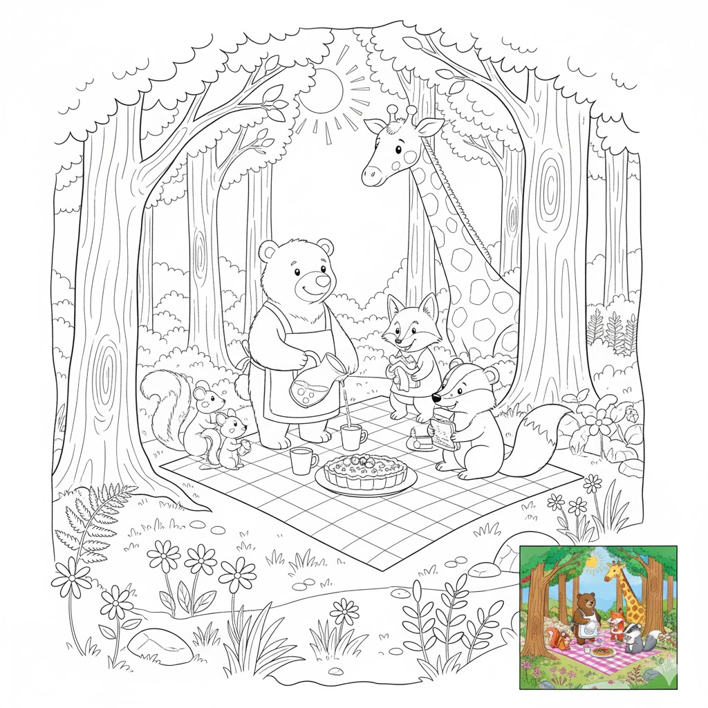 A large, clean black and white line art coloring page of [a group of diverse animals having a picnic in a forest] on a white background. A significantly smaller, detailed, realistically colored illustration of the same [a group of diverse animals having a picnic in a forest] is embedded as a miniature reference thumbnail in the bottom right corner, positioned clearly away from the main line art, ensuring no overlap. No text, labels, or watermarks are present. The overall style is that of a clean children's activity book page.