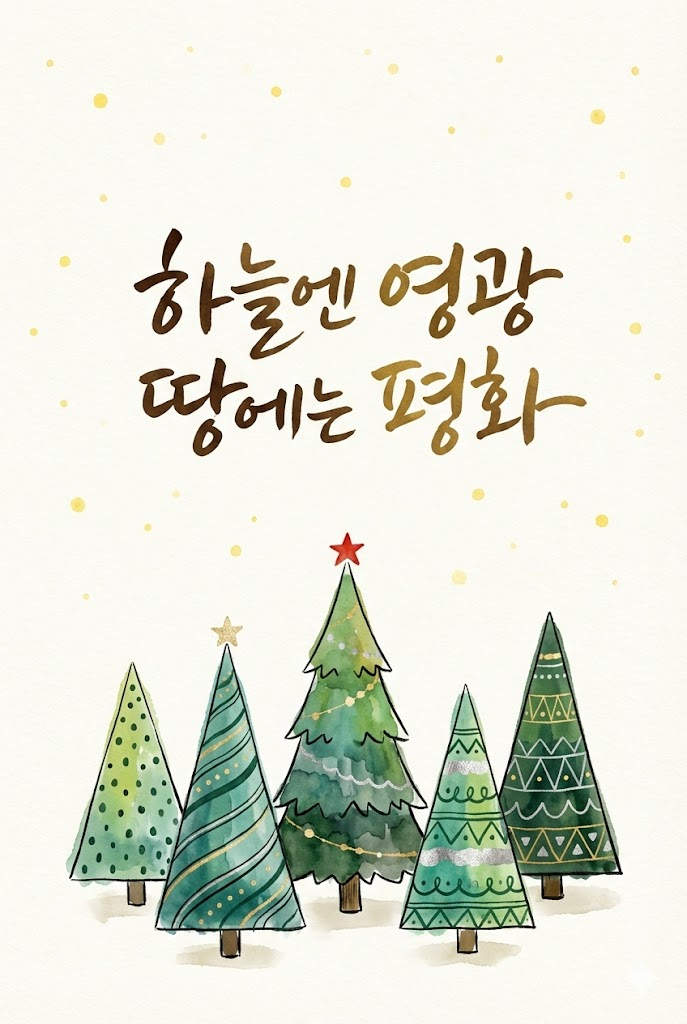 A beautiful and artistic greeting card design featuring elegant Korean calligraphy (Hangul) as the centerpiece. The calligraphy should clearly and beautifully display the text: [insert Korean message here: e.g., "하늘엔 영광 땅에는 평화" or a personalized blessing]. The composition includes a high-quality illustration of [specific seasonal theme or subject: e.g., a set of hand-drawn Christmas trees, hanging colorful ornaments, or a cozy snowy forest house]. The style is a mix of traditional watercolor and modern digital art, with a clean and professional layout. The background is [description of background: e.g., a textured paper feel or a deep navy night sky]. Full-bleed edge-to-edge digital graphic card illustration. No borders, no margins, no external background. The overall mood is warm, festive, and heartfelt. The Hangul text should be rendered in a stylish, hand-written brush stroke font, harmonizing with the visual elements. Just fill the card image completely. --ar 2:3