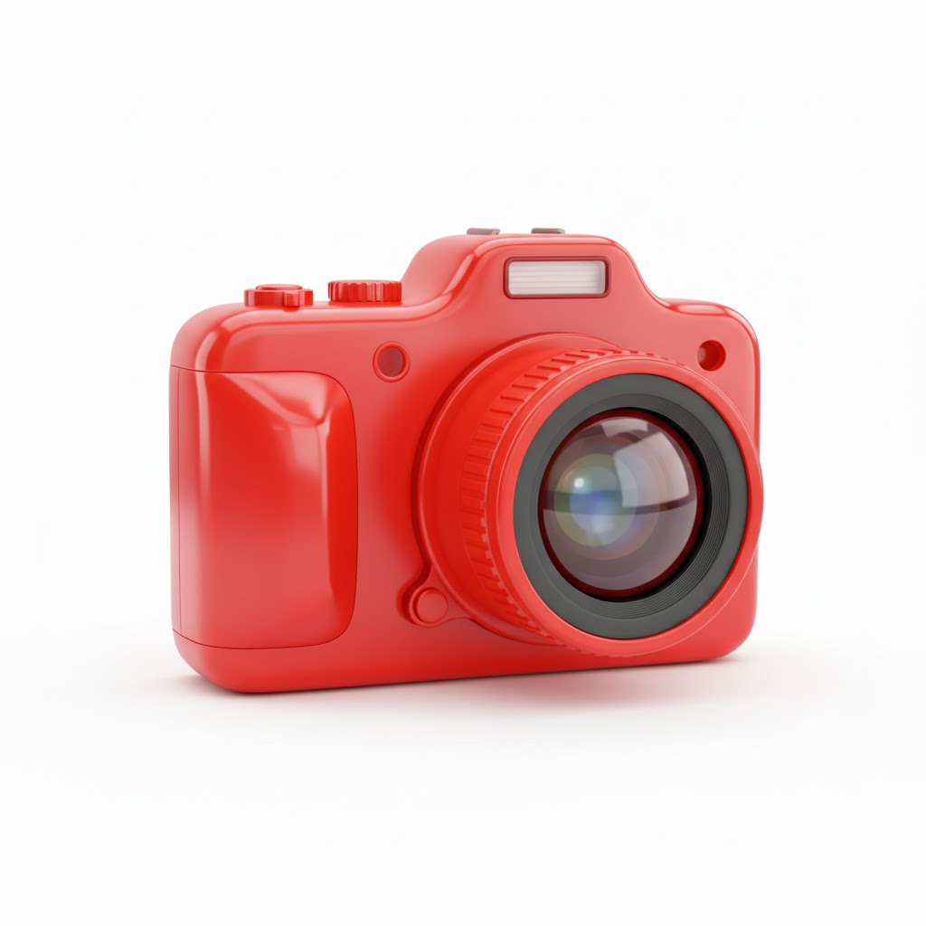 a 3D rendered icon of a camera in the style of the attached image, red colors, smooth glossy finish, simple, clean, isolated on a white background, studio light