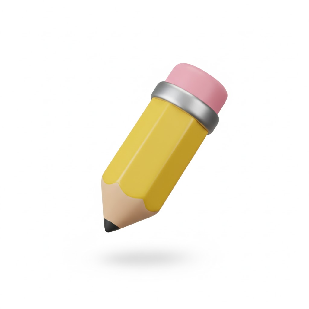 a 3D rendered icon of a pencil in the style of the attached image, yellow colors, smooth glossy finish, simple, clean, isolated on a white background, studio light