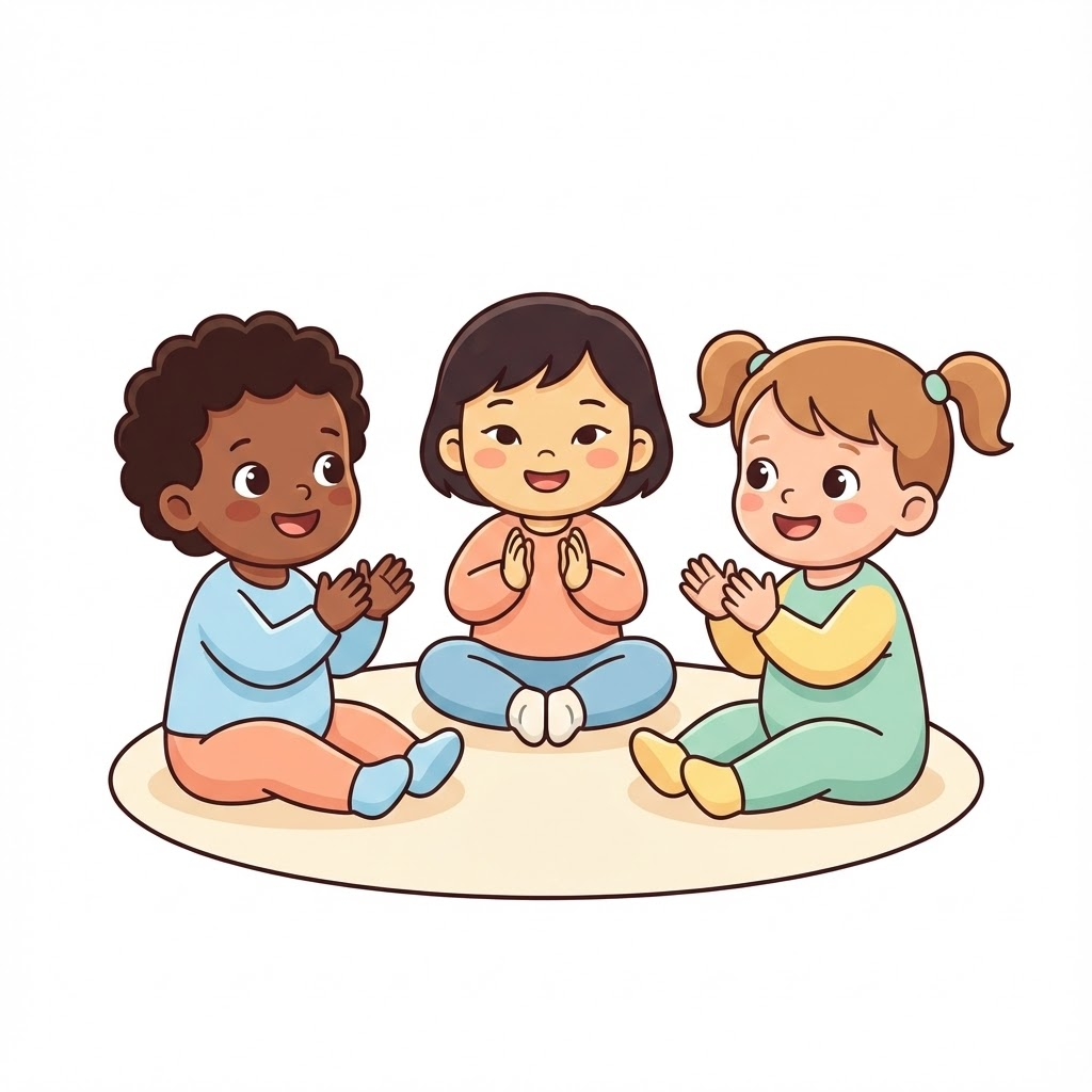 High-quality 2D digital illustration of three toddlers of different ethnicities sitting in a circle and clapping their hands joyfully, characters featuring large expressive eyes and cheerful smiles, soft pastel color palette, clean and precise outlines, minimalist vector art style, cozy and warm lighting, professional character design, high resolution, isolated on white background --ar 1:1