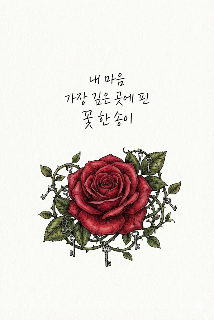A refined and detailed art piece on high-quality Premium art paper with a subtle texture. In the center, handwritten Korean text using a fine black ink pen that reads "내 마음 가장 깊은 곳에 핀 꽃 한 송이". Below or around the text, a beautiful and symbolic illustration of a detailed single red rose in full bloom surrounded by thorny vines and tiny key charms drawn in a detailed pen and colored ink style, featuring fine lines, intricate details, and rich colored ink washes of crimson reds, deep greens, and silver. The composition is clean, balanced, and elegant. No traditional stamps or seals. High resolution, aesthetic. Full-bleed edge-to-edge digital graphic card illustration. No borders, no margins, no external background. --ar 2:3