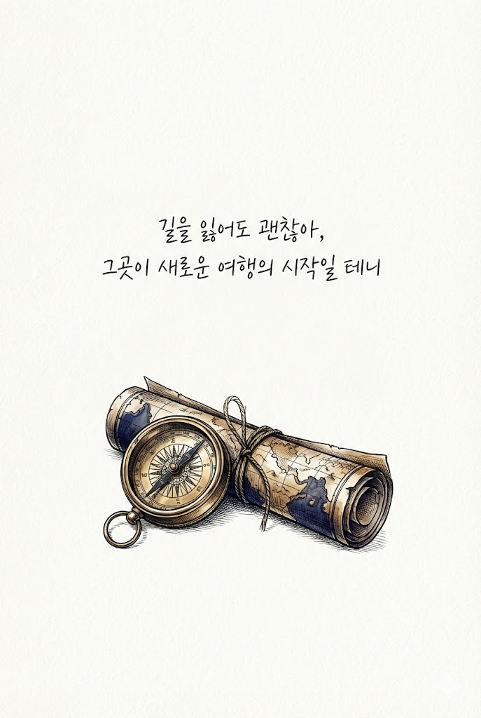 A refined and detailed art piece on high-quality Premium art paper with a subtle texture. In the center, handwritten Korean text using a fine black ink pen that reads "길을 잃어도 괜찮아, 그곳이 새로운 여행의 시작일 테니". Below or around the text, a beautiful and symbolic illustration of an antique brass compass and a rolled-up vintage map drawn in a detailed pen and colored ink style, featuring fine lines, intricate details, and rich colored ink washes of deep blues, sepia browns, and gold. The composition is clean, balanced, and elegant. No traditional stamps or seals. High resolution, aesthetic. Full-bleed edge-to-edge digital graphic card illustration. No borders, no margins, no external background. --ar 2:3