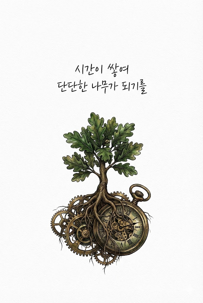 Example 2. 성장과 시간에 관한 문구 A refined and detailed art piece on high-quality Premium art paper with a subtle texture. In the center, handwritten Korean text using a fine black ink pen that reads "시간이 쌓여 단단한 나무가 되기를". Below or around the text, a beautiful and symbolic illustration of a detailed botanical drawing of an oak tree sapling with roots intertwined with old pocket watch gears drawn in a detailed pen and colored ink style, featuring fine lines, intricate details, and rich colored ink washes of forest greens, earthy browns, and metallic bronze. The composition is clean, balanced, and elegant. No traditional stamps or seals. High resolution, aesthetic. Full-bleed edge-to-edge digital graphic card illustration. No borders, no margins, no external background. --ar 2:3