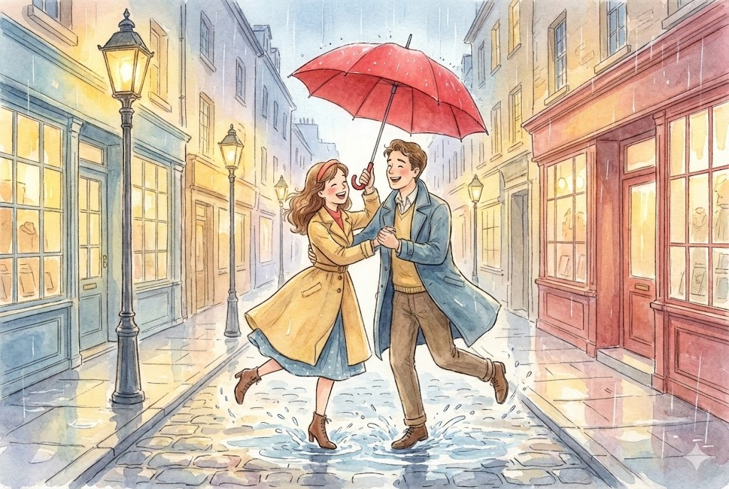 Heartwarming watercolor illustration featuring a happy couple dancing playfully under a red umbrella in a light rain on a cobblestone street, with water splashing under their feet. The art style emphasizes a cozy and nostalgic atmosphere with soft hand-drawn lines, delicate brushstrokes, and warm ambient lighting. The scene should feel intimate and emotional, capturing a quiet, beautiful moment between two people in a beautifully rendered environment with a soft, dreamy color palette. --ar 3:2