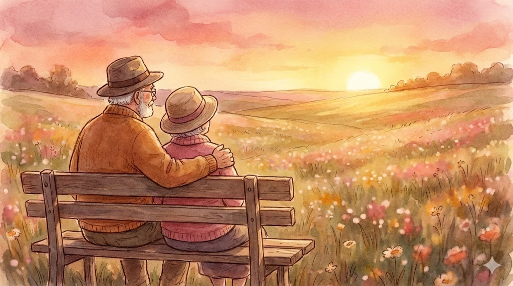 Heartwarming watercolor illustration featuring a couple sitting on a wooden bench, leaning on each other's shoulders while watching a vibrant orange and pink sunset over a field of wildflowers. The art style emphasizes a cozy and nostalgic atmosphere with soft hand-drawn lines, delicate brushstrokes, and warm ambient lighting. The scene should feel intimate and emotional, capturing a quiet, beautiful moment between two people in a beautifully rendered environment with a soft, dreamy color palette. --ar 16:9