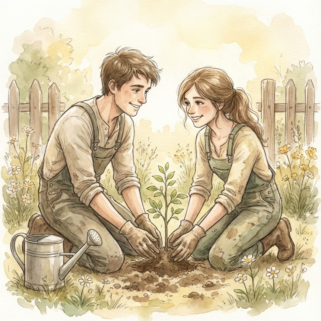 Heartwarming watercolor illustration featuring a young man and woman kneeling in a garden, smiling at each other as they carefully plant a small green sapling in the soil together. The art style emphasizes a cozy and nostalgic atmosphere with soft hand-drawn lines, delicate brushstrokes, and warm ambient lighting. The scene should feel intimate and emotional, capturing a quiet, beautiful moment between two people in a beautifully rendered environment with a soft, dreamy color palette. --ar 1:1