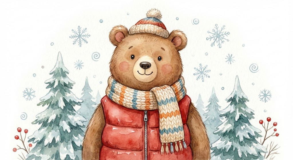 A charming watercolor illustration of a cute anthropomorphic baby bear, dressed in cozy winter attire including a red puffy vest and a warm knitted scarf. The art style is hand-drawn children's book illustration with gentle textured brushstrokes, visible paper grain, and a soft, warm color palette mixed with winter cool tones. The background is a whimsical winter wonderland scene with stylized falling snowflakes, frosted pine trees, and sparse winter berries. The overall mood is heartwarming, innocent, and whimsical. Isolated on a soft white background.