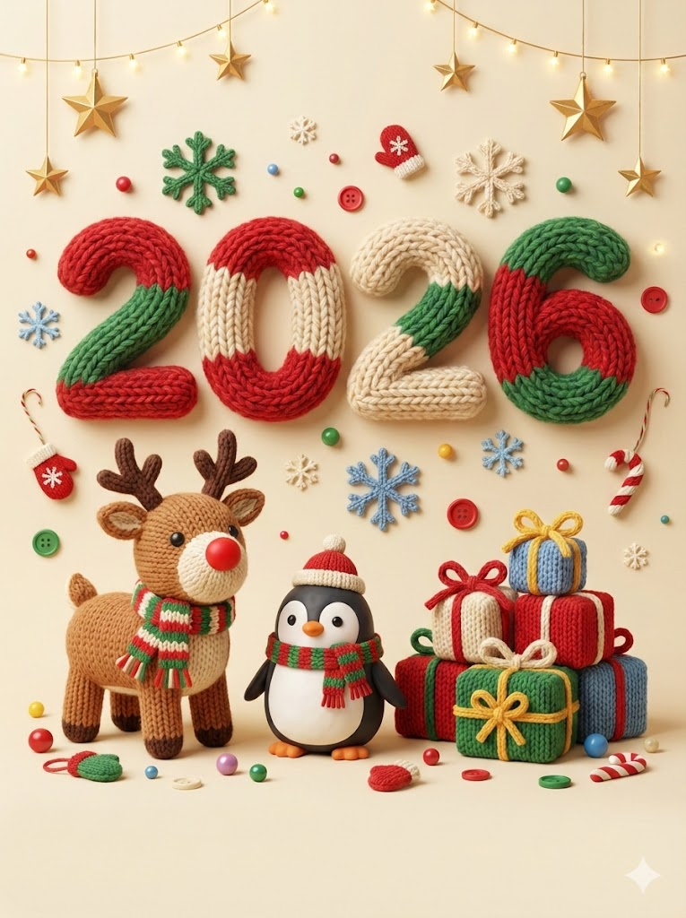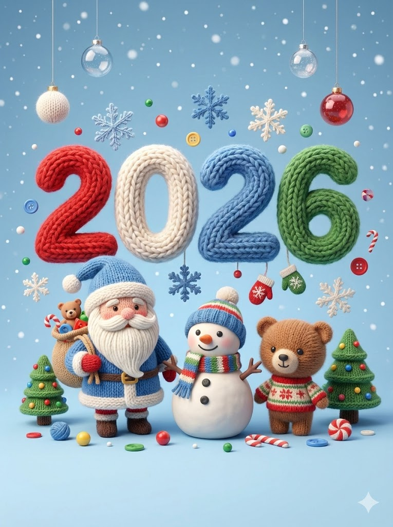 A charming, handcrafted-style illustration of [Year or Text, e.g., 2026] made from chunky knitted yarn. Below and around the numbers are cute figurines: [Main Characters and Elements, e.g., a knitted Santa, a clay snowman, a knitted bear, small knitted trees]. The scene is decorated with various knitted snowflakes, beads, and small festive elements against a [Background Details, e.g., soft blue background with falling snow and floating ornaments]. The overall texture is a delightful mix of cozy knitwear and smooth clay, rendered with soft, warm studio lighting. --ar 3:4