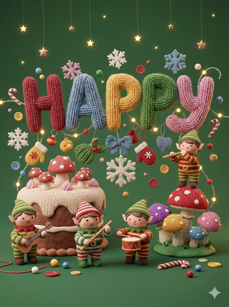 A charming, handcrafted-style illustration of HAPPY made from chunky knitted yarn. Below and around the numbers are cute figurines: several small knitted elves holding instruments, a large clay cake, and knitted mushroom decorations. The scene is decorated with various knitted snowflakes, beads, and small festive elements against a forest green background with tiny glowing fairy lights. The overall texture is a delightful mix of cozy knitwear and smooth clay, rendered with soft, warm studio lighting. --ar 3:4