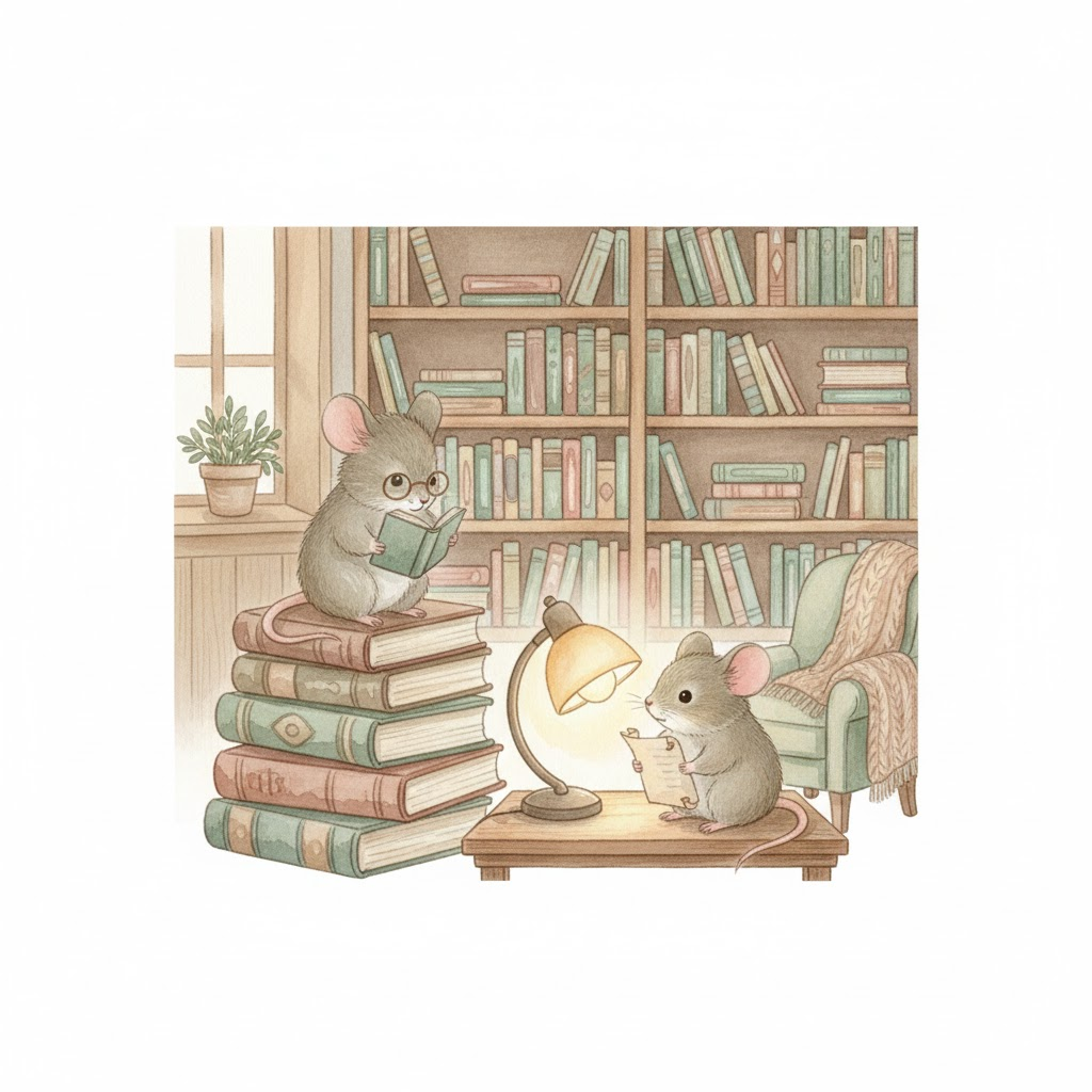 Generate an image in a soft pastel watercolor style, using a muted color palette consisting of cream, sage green, soft brown, and a hint of dusty rose. The image should evoke a warm and cozy atmosphere, depicting [귀여운 생쥐 2마리] in a [도서관에서 책을 보는 모습] with a plain white background