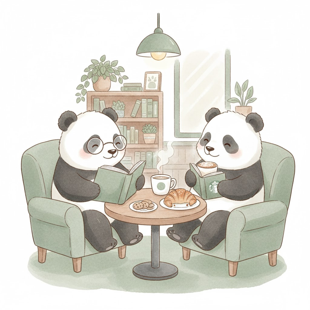 Generate an image in a soft pastel watercolor style, using a muted color palette consisting of cream, sage green, soft brown, and a hint of dusty rose. The image should evoke a warm and cozy atmosphere, depicting [three charming panda bears] in a [cozy Starbucks-like cafe, enjoying lattes and pastries, with one reading a book] with a plain white background