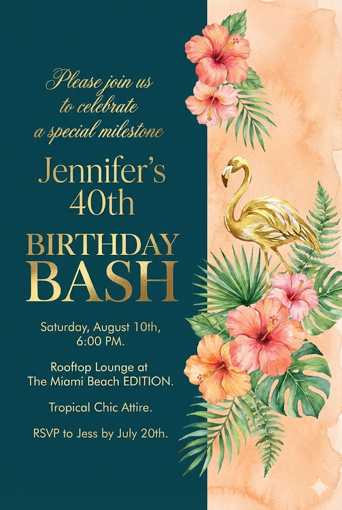 A direct, flat view of a sophisticated and elegant vertical invitation card design, full-bleed edge-to-edge digital graphic illustration. No borders, no margins, no external background. Aspect ratio: 2:3. The background is vertically divided into two distinct sections: the left section covers 2/3 of the card's width with [a solid deep teal], and the right section covers the remaining 1/3 with [a warm peach watercolor texture]. All typography and text elements are strictly placed and centered within the left 2/3 section. Beautifully rendered [watercolor tropical flowers like hibiscus and palm leaves] decorate the right 1/3 section, with [a vibrant gold flamingo] perched among them. The main text on the left includes the phrase "Please join us to celebrate a special milestone" in luxurious gold script, the name(s) "Jennifer's 40th] in elegant gold typography, and the word "BIRTHDAY BASH" in large, bold gold foil letters. All secondary details: "Saturday, August 10th, 6:00 PM. Rooftop Lounge at The Miami Beach EDITION. Tropical Chic Attire. RSVP to Jess by July 20th." are written in clean gold and white sans-serif fonts on the left side. The overall atmosphere is royal, elegant, and celebratory.