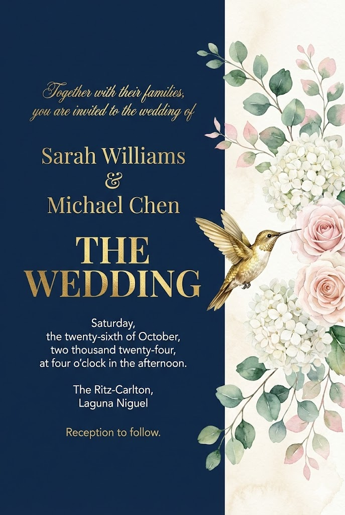 A direct, flat view of a sophisticated and elegant vertical invitation card design, full-bleed edge-to-edge digital graphic illustration. No borders, no margins, no external background. Aspect ratio: 2:3. The background is vertically divided into two distinct sections: the left section covers 2/3 of the card's width with [a solid deep navy blue], and the right section covers the remaining 1/3 with [a light cream watercolor texture]. All typography and text elements are strictly placed and centered within the left 2/3 section. Beautifully rendered [watercolor white hydrangeas, eucalyptus, and blush roses] decorate the right 1/3 section, with [a realistic gold hummingbird] perched among them. The main text on the left includes the phrase "Together with their families, you are invited to the wedding of" in luxurious gold script, the name(s) "Sarah Williams & Michael Chen" in elegant gold typography, and the word "THE WEDDING" in large, bold gold foil letters. All secondary details: "Saturday, the twenty-sixth of October, two thousand twenty-four, at four o'clock in the afternoon. The Ritz-Carlton, Laguna Niguel. Reception to follow." are written in clean gold and white sans-serif fonts on the left side. The overall atmosphere is royal, elegant, and celebratory.