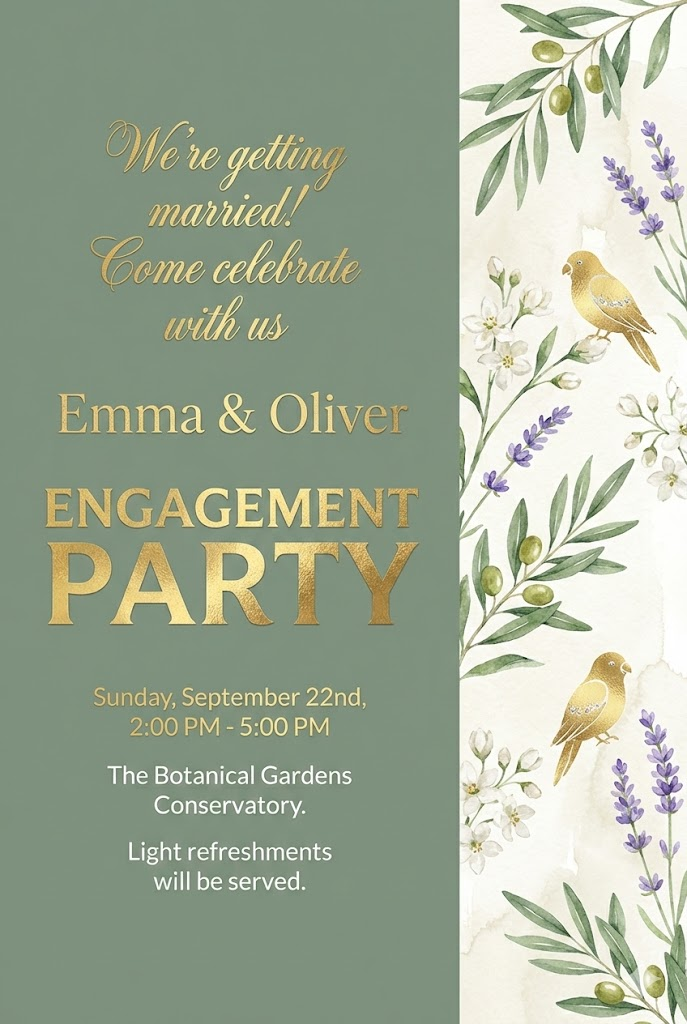 A direct, flat view of a sophisticated and elegant vertical invitation card design, full-bleed edge-to-edge digital graphic illustration. No borders, no margins, no external background. Aspect ratio: 2:3. The background is vertically divided into two distinct sections: the left section covers 2/3 of the card's width with [a solid muted sage green], and the right section covers the remaining 1/3 with [an ivory watercolor texture]. All typography and text elements are strictly placed and centered within the left 2/3 section. Beautifully rendered [watercolor olive branches, lavender sprigs, and small white blossoms] decorate the right 1/3 section, with [two small gold lovebirds] perched among them. The main text on the left includes the phrase "We're getting married! Come celebrate with us" in luxurious gold script, the name(s) "Emma & Oliver" in elegant gold typography, and the word "ENGAGEMENT PARTY" in large, bold gold foil letters. All secondary details: "Sunday, September 22nd, 2:00 PM - 5:00 PM. The Botanical Gardens Conservatory. Light refreshments will be served." are written in clean gold and white sans-serif fonts on the left side. The overall atmosphere is royal, elegant, and celebratory.