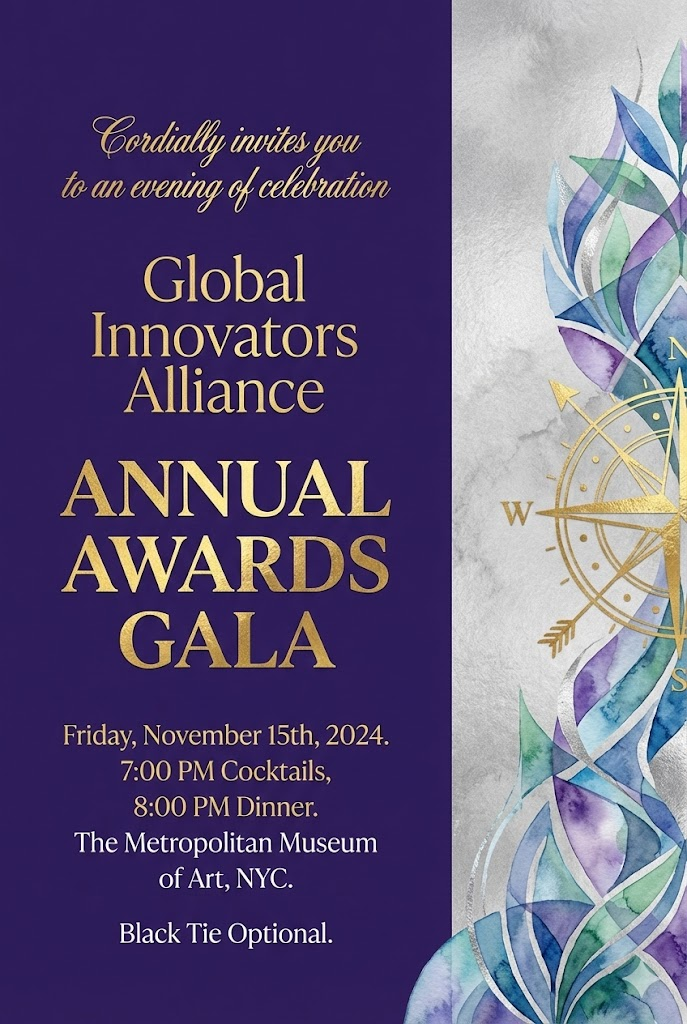A direct, flat view of a sophisticated and elegant vertical invitation card design, full-bleed edge-to-edge digital graphic illustration. No borders, no margins, no external background. Aspect ratio: 2:3. The background is vertically divided into two distinct sections: the left section covers 2/3 of the card's width with [a solid dark royal purple], and the right section covers the remaining 1/3 with [a silver-grey watercolor texture]. All typography and text elements are strictly placed and centered within the left 2/3 section. Beautifully rendered [abstract watercolor geometric botanical patterns in cool tones] decorate the right 1/3 section, with [a stylized gold compass rose] perched among them. The main text on the left includes the phrase "Cordially invites you to an evening of celebration" in luxurious gold script, the name(s) "Global Innovators Alliance" in elegant gold typography, and the word "ANNUAL AWARDS GALA" in large, bold gold foil letters. All secondary details: "Friday, November 15th, 2024. 7:00 PM Cocktails, 8:00 PM Dinner. The Metropolitan Museum of Art, NYC. Black Tie Optional." are written in clean gold and white sans-serif fonts on the left side. The overall atmosphere is royal, elegant, and celebratory.