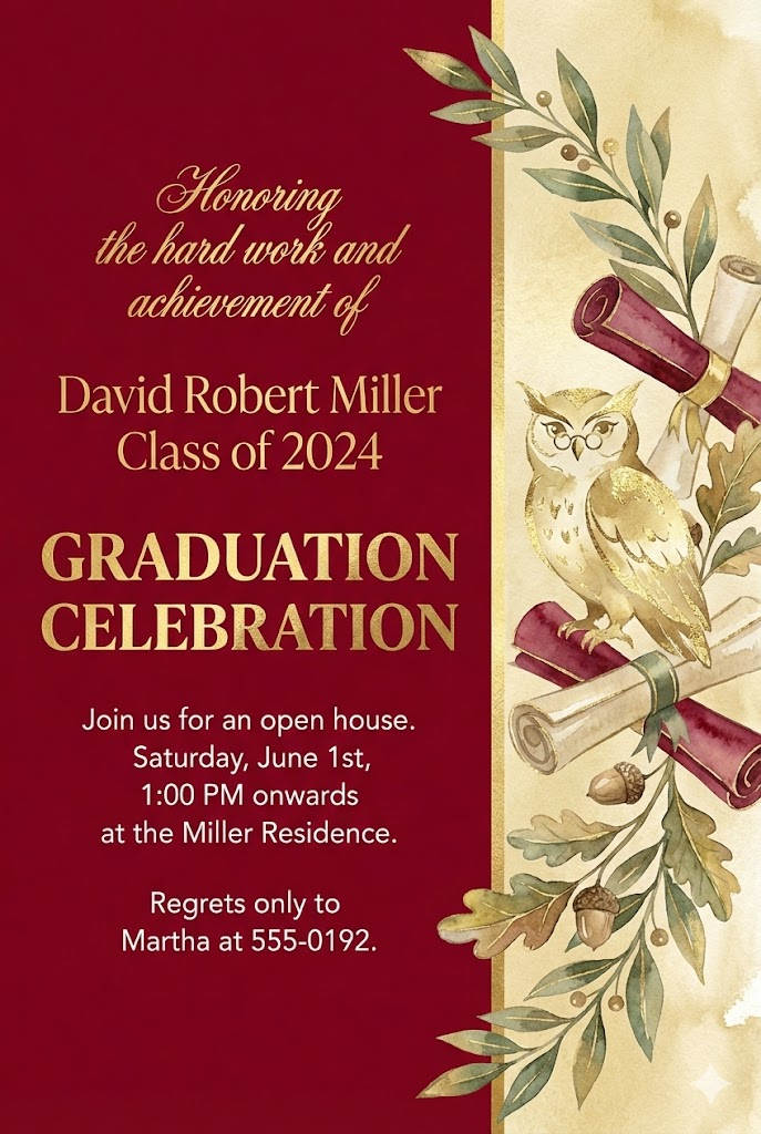 A direct, flat view of a sophisticated and elegant vertical invitation card design, full-bleed edge-to-edge digital graphic illustration. No borders, no margins, no external background. Aspect ratio: 2:3. The background is vertically divided into two distinct sections: the left section covers 2/3 of the card's width with [a solid deep crimson red], and the right section covers the remaining 1/3 with [a light gold watercolor texture]. All typography and text elements are strictly placed and centered within the left 2/3 section. Beautifully rendered [watercolor laurel branches, oak leaves, and scrolls] decorate the right 1/3 section, with [a wise gold owl] perched among them. The main text on the left includes the phrase "Honoring the hard work and achievement of" in luxurious gold script, the name(s) "David Robert Miller, Class of 2024" in elegant gold typography, and the word "GRADUATION CELEBRATION" in large, bold gold foil letters. All secondary details: "Join us for an open house. Saturday, June 1st, 1:00 PM onwards at the Miller Residence. Regrets only to Martha at 555-0192." are written in clean gold and white sans-serif fonts on the left side. The overall atmosphere is royal, elegant, and celebratory.