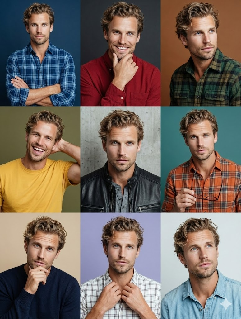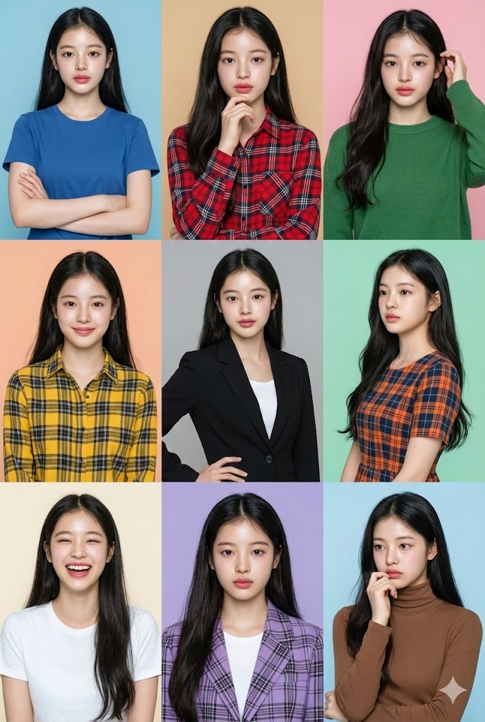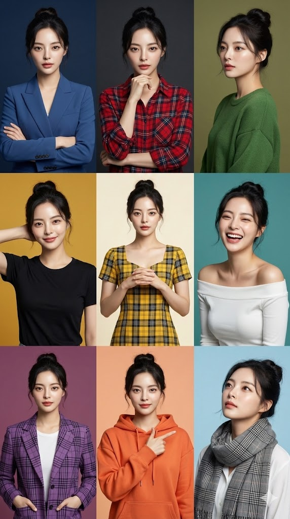 - 다채로운 스타일 변화 (Varied Styles): 얼굴은 같지만, 각 컷마다 다른 의상(단색과 체크무늬 혼합), 독특한 포즈와 제스처, 그리고 서로 다른 배경 색상 테마를 적용하여 지루하지 않고 풍부한 시각적 다양성을 제공합니다.