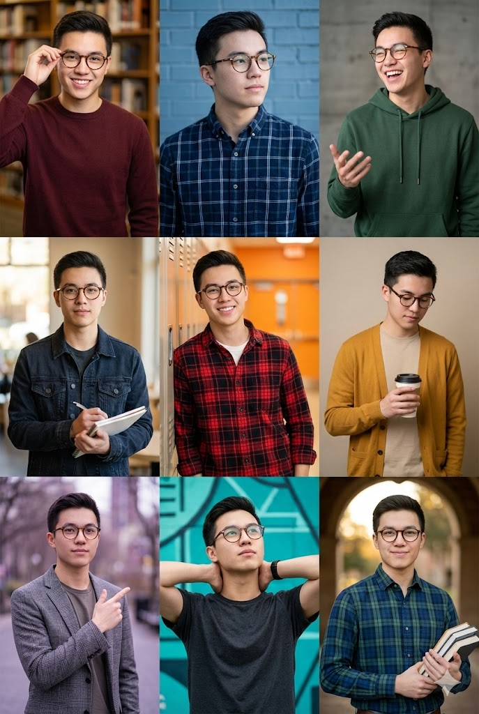 Generate 9 hyper-realistic 8K portraits of the same [a student with glasses] with identical facial identity (100% identical) to the submitted photo. Arrange them in a 3x3 grid (vertical orientation), with each image showing the [a student with glasses] wearing different outfits (mixing solid colors and plaid). Each scene must feature a unique pose, gesture, and background color scheme.