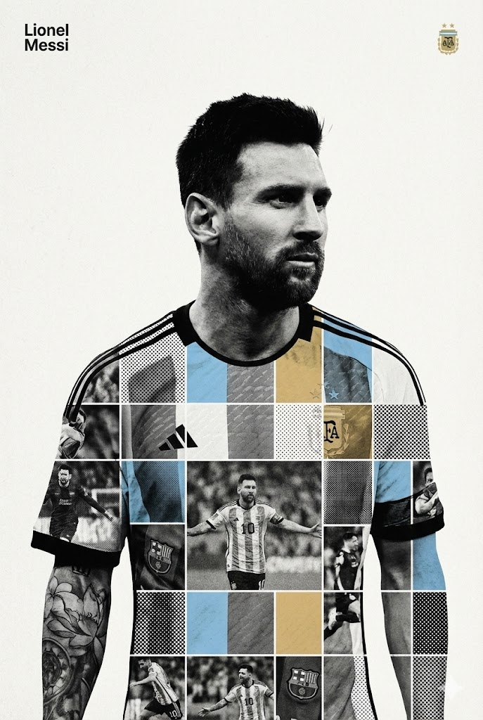 Act as a high-end sports graphic designer creating a conceptual tribute poster. The style is a complex "dual exposure photo-grid composite" with mixed-media textures. CENTRAL STRUCTURE (THE VESSEL): The central focus is a large-scale, high-contrast black and white portrait silhouette of Lionel Messi. This main portrait acts as the container. THE GRID FILL & TEXTURES (MIXED MEDIA): The interior of the silhouette is populated by a dense "photo mosaic grid" of action shots from the person's career. CRITICAL TEXTURE INSTRUCTION: Do not just paste flat photos. Apply artistic textures to various grid cells to create a tactile, collage feel. Use effects like: Halftone Dots: Comic-book style raster patterns on some cells. Fabric/Embroidery: Subtle thread or canvas textures suggesting a jersey or patch. Film Grain: Heavy noise on specific high-contrast action shots. COLOR STRATEGY: The base is Monochrome B&W. Use selective color overlays (relevant to the team/flag) ONLY on specific grid cells to create a rhythm. TYPOGRAPHY & BRANDING (STRICT MICRO-SCALING): Top Left (The Name): Write "Lionel Messi" strictly using the font Inter Semibold. Kerning: Tight negative kerning (-4%). Size: SMALL and discreet. It must occupy MAXIMUM 20% of the canvas width. Do NOT make it large or loud. Top Right (The Symbol): Place the primary logo (Argentina national football team crest). Size: VERY SMALL. It must occupy MAXIMUM 10% of the canvas width. COMPOSITION & BACKGROUND: Background: Off-white or light grey with a visible high-quality paper or concrete texture. It should not be flat digital white. Alignment: Center the figure perfectly. Maintain wide negative space around the object. --ar 2:3