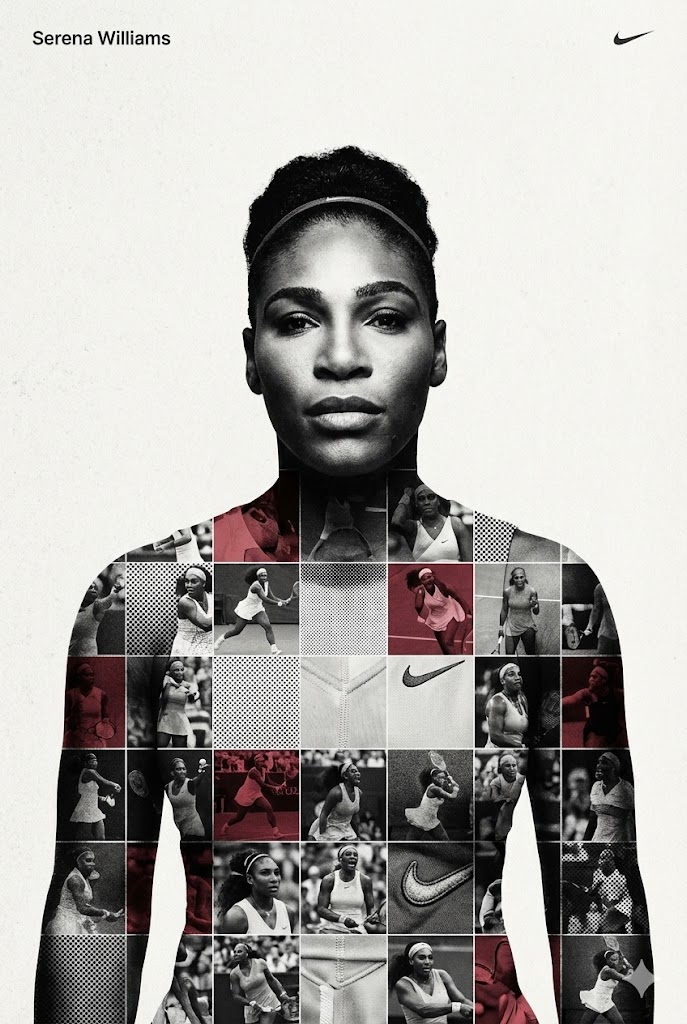 Act as a high-end sports graphic designer creating a conceptual tribute poster. The style is a complex "dual exposure photo-grid composite" with mixed-media textures. CENTRAL STRUCTURE (THE VESSEL): The central focus is a large-scale, high-contrast black and white portrait silhouette of Serena Williams. This main portrait acts as the container. THE GRID FILL & TEXTURES (MIXED MEDIA): The interior of the silhouette is populated by a dense "photo mosaic grid" of action shots from the person's career. CRITICAL TEXTURE INSTRUCTION: Do not just paste flat photos. Apply artistic textures to various grid cells to create a tactile, collage feel. Use effects like: Halftone Dots: Comic-book style raster patterns on some cells. Fabric/Embroidery: Subtle thread or canvas textures suggesting a jersey or patch. Film Grain: Heavy noise on specific high-contrast action shots. COLOR STRATEGY: The base is Monochrome B&W. Use selective color overlays (relevant to the team/flag) ONLY on specific grid cells to create a rhythm. TYPOGRAPHY & BRANDING (STRICT MICRO-SCALING): Top Left (The Name): Write "Serena Williams" strictly using the font Inter Semibold. Kerning: Tight negative kerning (-4%). Size: SMALL and discreet. It must occupy MAXIMUM 20% of the canvas width. Do NOT make it large or loud. Top Right (The Symbol): Place the primary logo (Nike swoosh logo). Size: VERY SMALL. It must occupy MAXIMUM 10% of the canvas width. COMPOSITION & BACKGROUND: Background: Off-white or light grey with a visible high-quality paper or concrete texture. It should not be flat digital white. Alignment: Center the figure perfectly. Maintain wide negative space around the object. --ar 2:3
