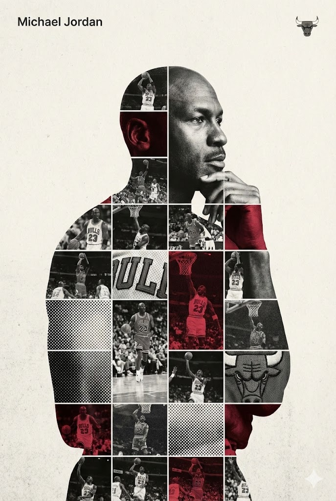 Act as a high-end sports graphic designer creating a conceptual tribute poster. The style is a complex "dual exposure photo-grid composite" with mixed-media textures. CENTRAL STRUCTURE (THE VESSEL): The central focus is a large-scale, high-contrast black and white portrait silhouette of Michael Jordan. This main portrait acts as the container. THE GRID FILL & TEXTURES (MIXED MEDIA): The interior of the silhouette is populated by a dense "photo mosaic grid" of action shots from the person's career. CRITICAL TEXTURE INSTRUCTION: Do not just paste flat photos. Apply artistic textures to various grid cells to create a tactile, collage feel. Use effects like: Halftone Dots: Comic-book style raster patterns on some cells. Fabric/Embroidery: Subtle thread or canvas textures suggesting a jersey or patch. Film Grain: Heavy noise on specific high-contrast action shots. COLOR STRATEGY: The base is Monochrome B&W. Use selective color overlays (relevant to the team/flag) ONLY on specific grid cells to create a rhythm. TYPOGRAPHY & BRANDING (STRICT MICRO-SCALING): Top Left (The Name): Write "Michael Jordan" strictly using the font Inter Semibold. Kerning: Tight negative kerning (-4%). Size: SMALL and discreet. It must occupy MAXIMUM 20% of the canvas width. Do NOT make it large or loud. Top Right (The Symbol): Place the primary logo (Chicago Bulls logo). Size: VERY SMALL. It must occupy MAXIMUM 10% of the canvas width. COMPOSITION & BACKGROUND: Background: Off-white or light grey with a visible high-quality paper or concrete texture. It should not be flat digital white. Alignment: Center the figure perfectly. Maintain wide negative space around the object. --ar 2:3