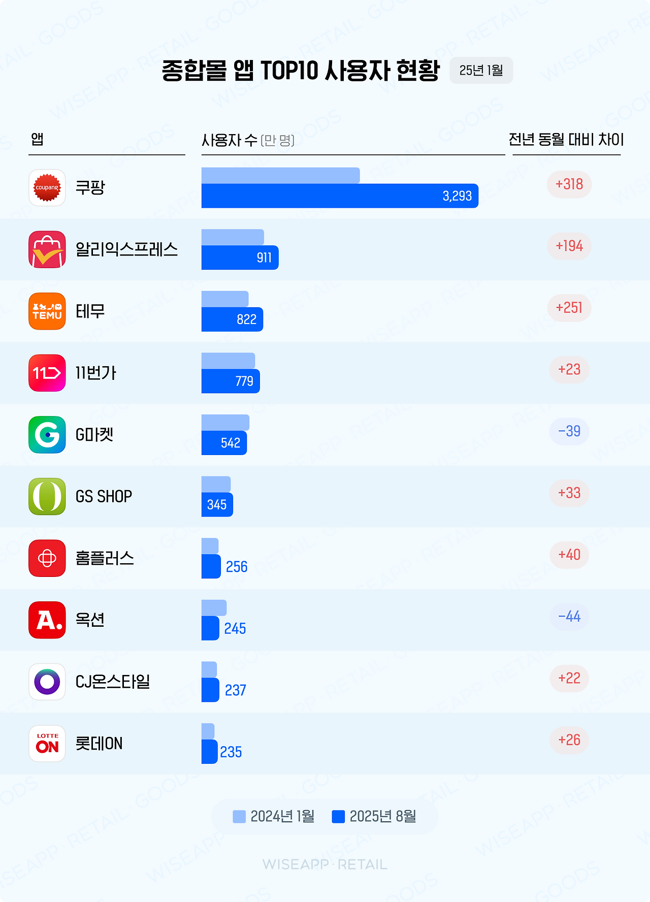 WISEAPP의 2025년 1월 조사에 따르면, **알리익스프레스(911만 명, +194만 명 증가)**와 **테무(822만 명, +251만 명 증가)**의 사용자 수가 급격히 증가했습니다. 반면, **G마켓(542만 명, -39만 명 감소)**과 **옥션(245만 명, -44만 명 감소)**은 하락세를 보였습니다. 과연 C-커머스가 한국 e커머스를 장악할 수 있을까요?