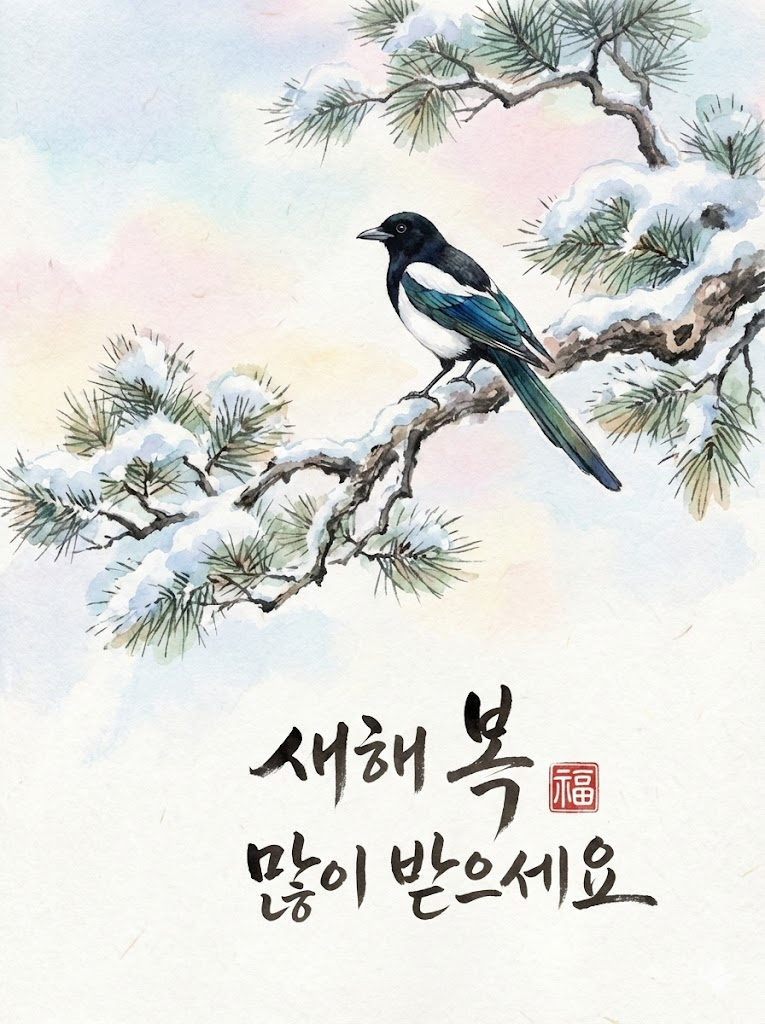 A masterpiece New Year's greeting card, Korean traditional ink wash painting style mixed with soft watercolor, 눈 내린 소나무 가지에 앉아있는 까치 한 마리, elegant brush calligraphy text wishing 새해 복 많이 받으세요, stamped with a red Square seal saying 福, serene and festive atmosphere, pastel tones, high quality, highly detailed texture, white background space, --ar 3:4