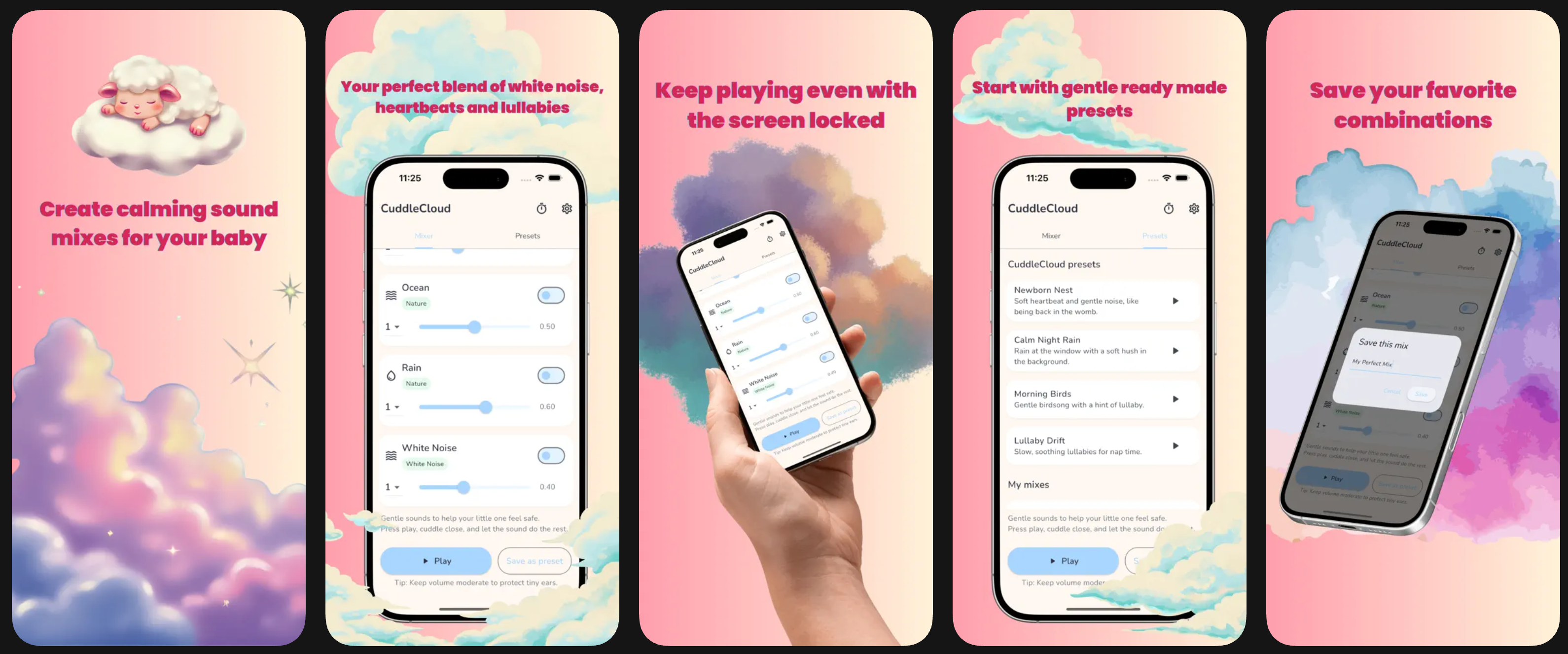 CuddleCloud는 단순한 백색 소음 앱이 아니에요. 간단한 슬라이더 조작만으로 여러 가지 부드러운 사운드를 자유롭게 조합하여, 우리 아기에게 가장 편안한 수면 환경을 조성해 줄 수 있답니다.