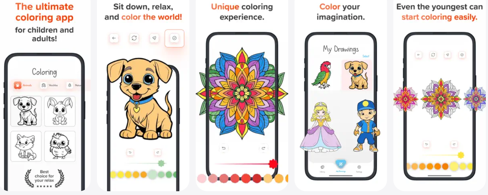 이 앱은 이름 그대로 아이들과 어른이 함께 즐길 수 있는 컬러링 북입니다. 단순한 시간 때우기용이 아니라, 힐링과 교육 두 마리 토끼를 다 잡은 퀄리티 높은 앱이에요.