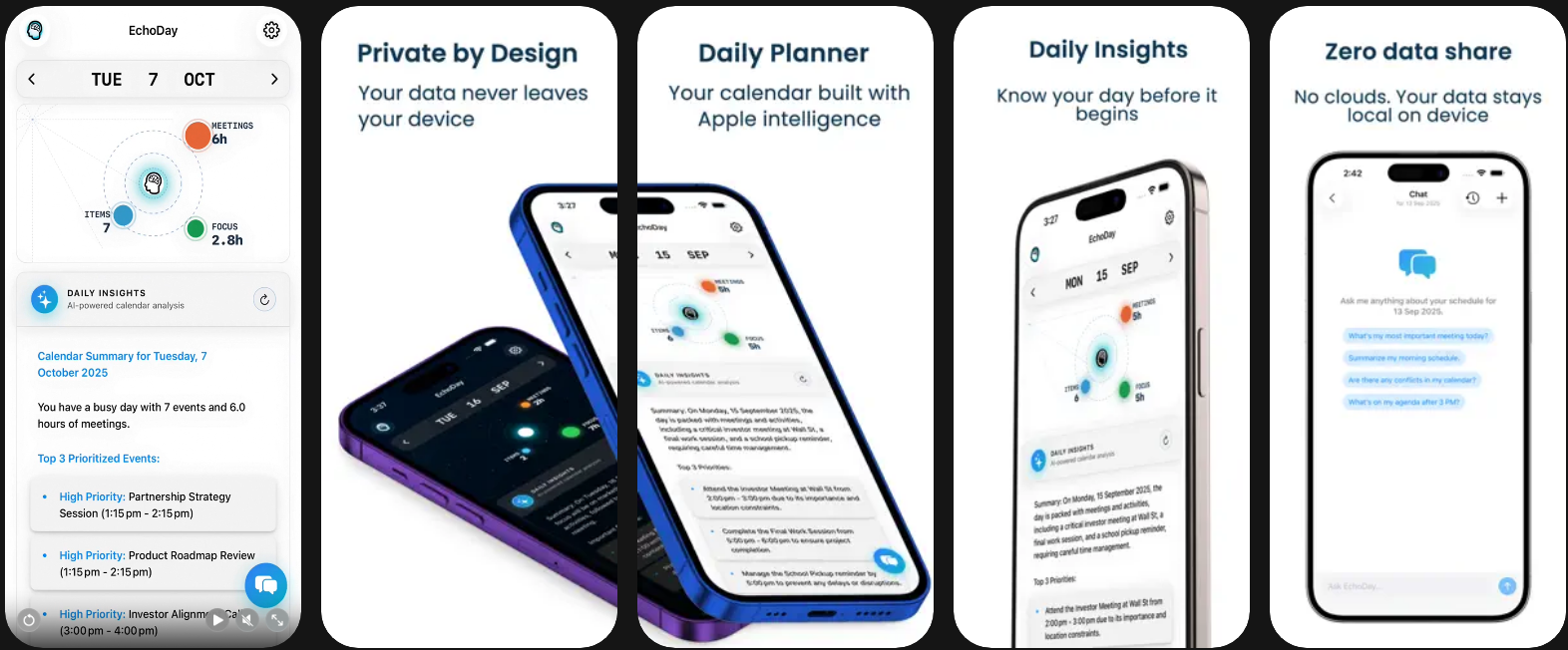 **'Daily Planner: AI EchoDay'**는 애플 기기에 최적화된 보안 중심의 AI 캘린더 비서입니다.