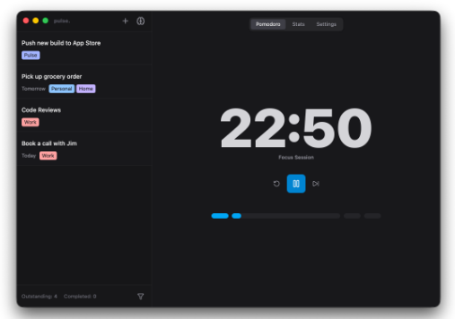Download Pulse for MacOSPulse is a fast and distraction-free Pomodoro app designed to help you actually finish the work you care about.No clutter. No bloated features. Just a clean timer, your tasks, a focus mode with animated backgrounds and sounds, and a