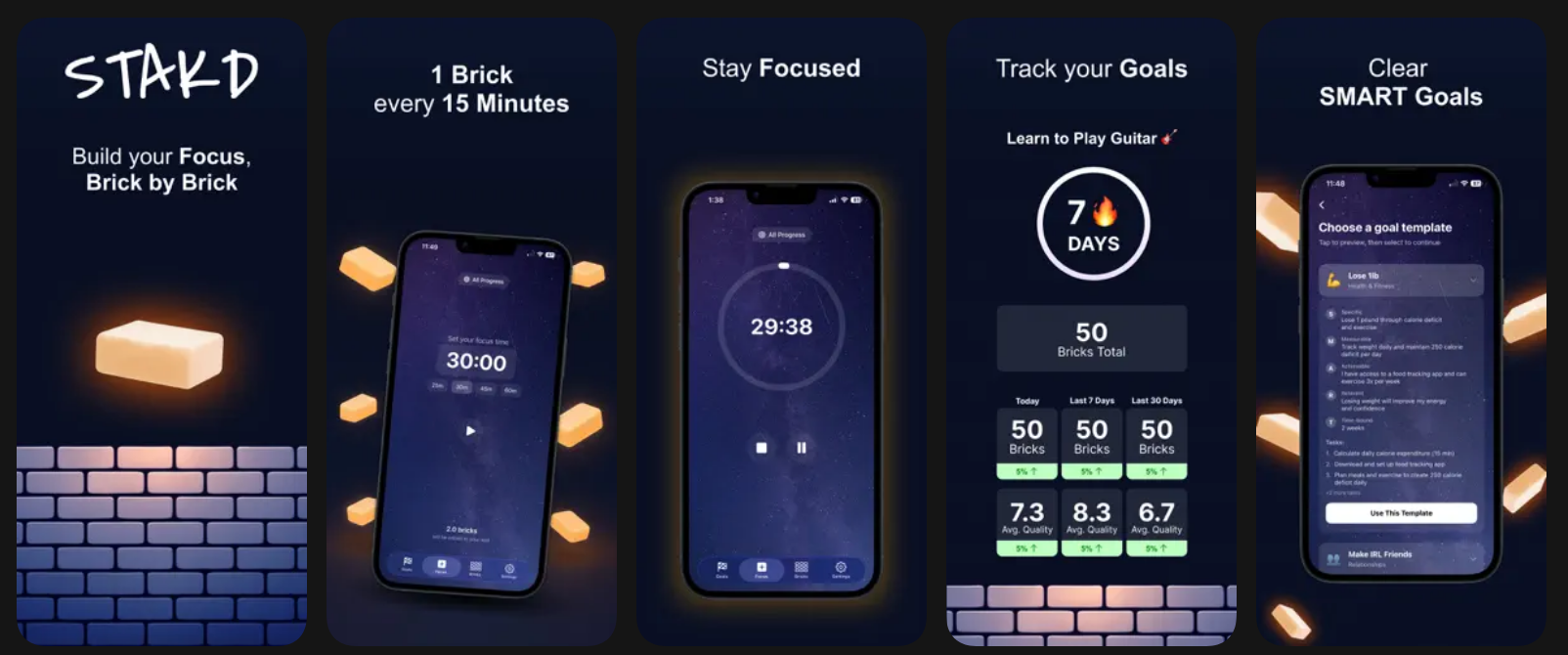 STAKD는 단순한 포모도로 타이머가 아닙니다. 사용자가 집중하는 시간을 **'벽돌을 쌓는 과정'**으로 시각화하여, 나의 노력이 어떻게 쌓여가는지 직관적으로 보여주는 매력적인 앱입니다.