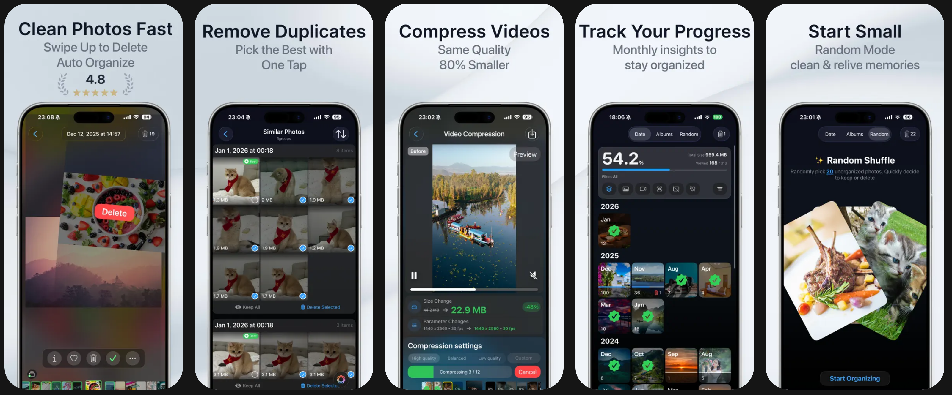 - 스와이프 정리 (Swipe-based Cleanup): 마치 데이팅 앱처럼! 위로 스와이프 해서 삭제, 앨범 정리도 터치 몇 번으로 끝납니다. 복잡한 학습 없이 바로 사용할 수 있는 직관적인 UI가 장점입니다.