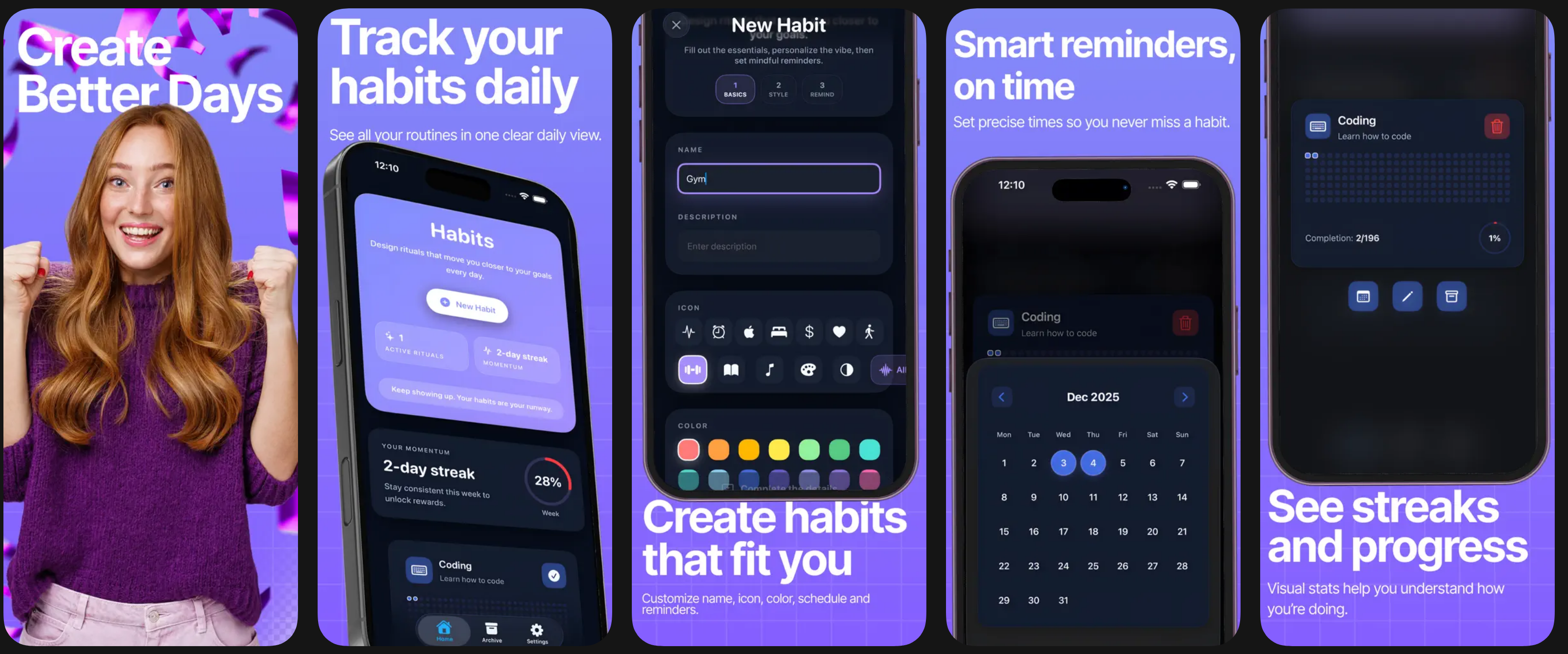 "더 나은 나를 만드는 습관 추적기" 이 앱은 복잡한 기능은 덜어내고, 시각적인 진행 상황과 단순함에 집중하여 여러분의 목표 달성을 돕는 앱입니다. 긍정적인 루틴은 만들고, 나쁜 습관은 끊어낼 수 있도록 도와줍니다.