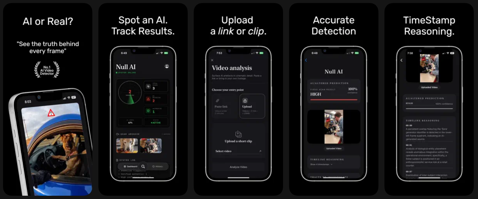Null AI는 고도화된 인공지능 기술을 활용해 영상이 실제(Real)인지, 아니면 AI로 생성된 가짜(AI-generated)인지 분석해 주는 보안 솔루션 앱입니다.