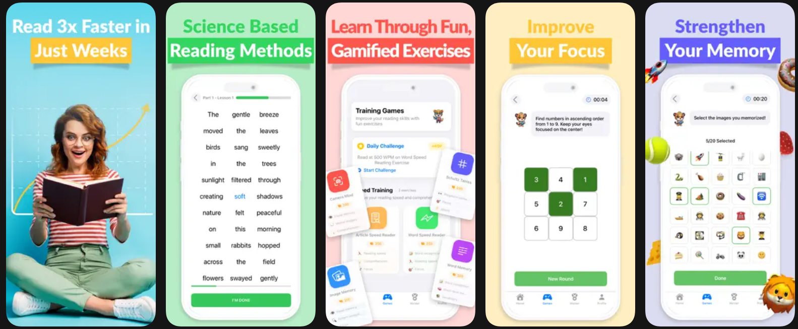 - 🎮 게임 같은 훈련 방식: 지루한 공부가 아닙니다! 단어/문장 속독, 슐츠 테이블(Schultz tables), 기억력 운동 등 게임처럼 재미있는 드릴을 제공합니다.