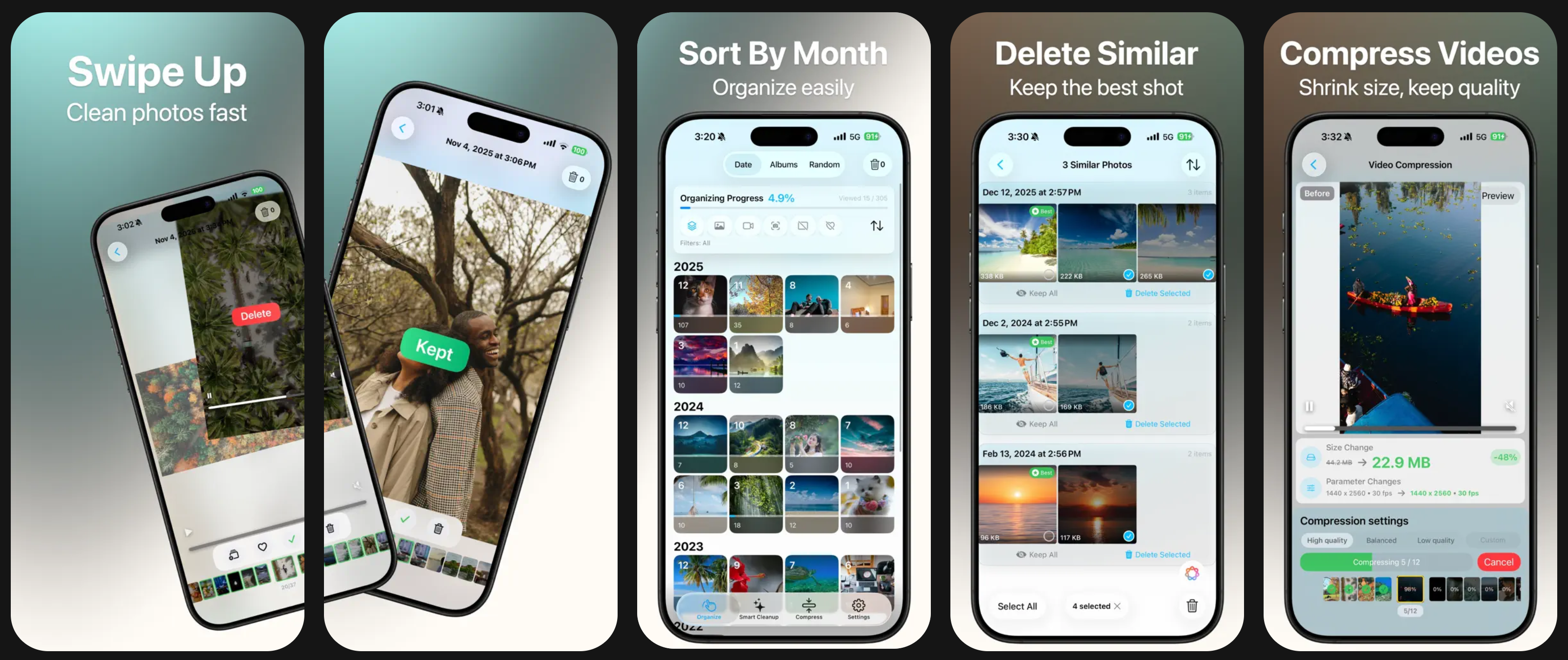 - 👆 스와이프 정리 (Swipe to Clean): 위로 스와이프하면 삭제 리스트로, 좌우로 스와이프하면 사진을 훑어볼 수 있습니다. 마치 데이팅 앱을 하듯 재미있고 빠르게 정리가 가능해요!