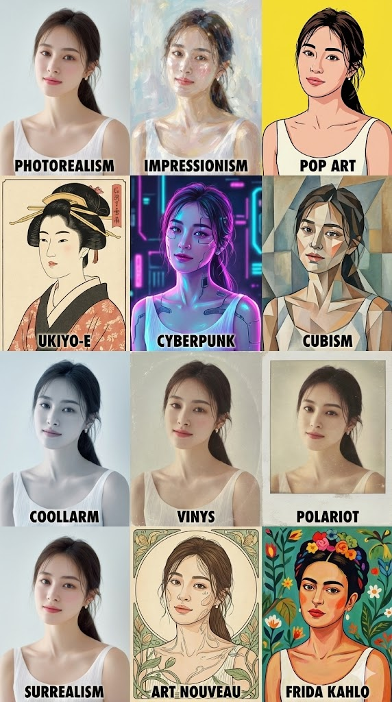 Row 2: Ukiyo-e, Cyberpunk, Cubism Row 3: Coollarm, Vinys, Polariot Row 4: Surrealism, Art Nouveau, Frida Kahlo style. At the bottom of each individual panel, clearly write the name of the corresponding art style in a small, bold, and legible font. Ensure high contrast between the text and the background. The overall image should be a high-quality design reference sheet, 8k resolution. --ar 9:16