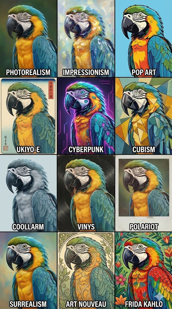 Strict 3x4 grid matrix composition, arranged in 4 rows and 3 columns, totaling 12 equal panels. Inside each panel, depict the exact same Colorful Macaw Parrot close-up in the same pose and composition. Render the panels sequentially from top-left to bottom-right in the following 12 art styles: Row 1: Photorealism, Impressionism, Pop Art Row 2: Ukiyo-e, Cyberpunk, Cubism Row 3: Coollarm, Vinys, Polariot Row 4: Surrealism, Art Nouveau, Frida Kahlo style At the bottom of each individual panel, clearly write the name of the corresponding art style in a small, bold, and legible font. Ensure high contrast between the text and the background. The overall image should be a high-quality design reference sheet, 8k resolution. --ar 9:16