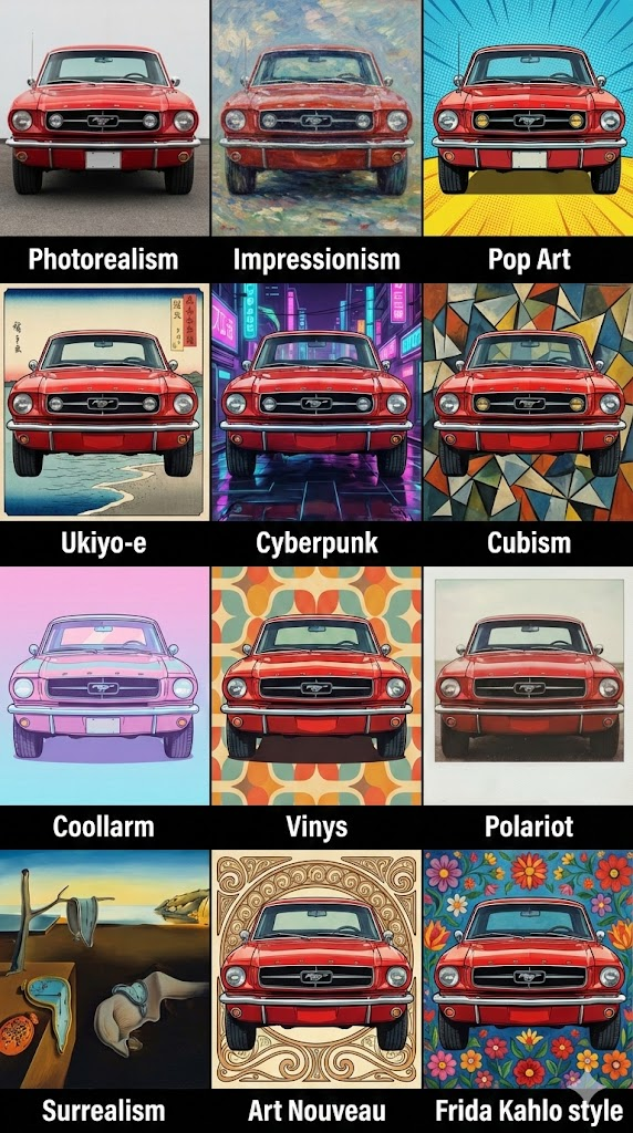 Strict 3x4 grid matrix composition, arranged in 4 rows and 3 columns, totaling 12 equal panels. Inside each panel, depict the exact same Classic red Mustang car front view in the same pose and composition. Render the panels sequentially from top-left to bottom-right in the following 12 art styles: Row 1: Photorealism, Impressionism, Pop Art Row 2: Ukiyo-e, Cyberpunk, Cubism Row 3: Coollarm, Vinys, Polariot Row 4: Surrealism, Art Nouveau, Frida Kahlo style. At the bottom of each individual panel, clearly write the name of the corresponding art style in a small, bold, and legible font. Ensure high contrast between the text and the background. The overall image should be a high-quality design reference sheet, 8k resolution. --ar 9:16