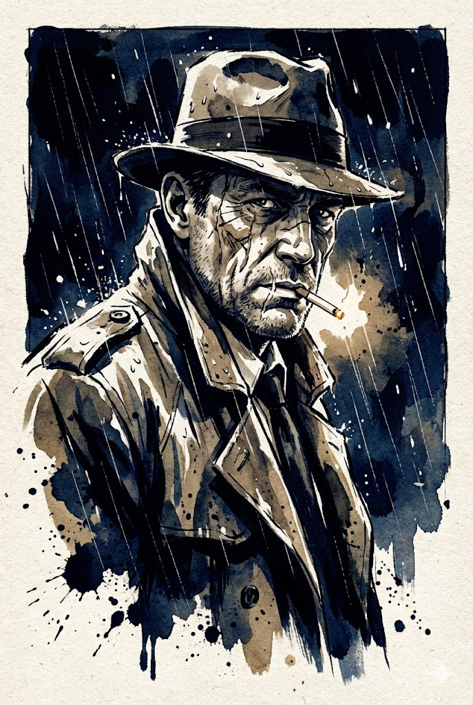 A high-contrast ink noir portrait of a grizzled detective with a scarred face, wearing a soaked trench coat and fedora, smoking a cigarette under heavy rain at night, illustrated entirely in a raw, expressive colored ink wash and controlled splatter style, reminiscent of traditional sumi-e painting meets gritty graphic novel art (think Frank Miller's Sin City aesthetic but in color). Deep, heavy shadows dominate the composition (chiaroscuro lighting), with selective, sharp highlights emerging purely through negative space and white paper. Visible coarse paper grain texture. The atmosphere is moody, cinematic, intense, and dramatic, frozen in time. Rich, saturated color palette with deep ink tones. --ar 2:3