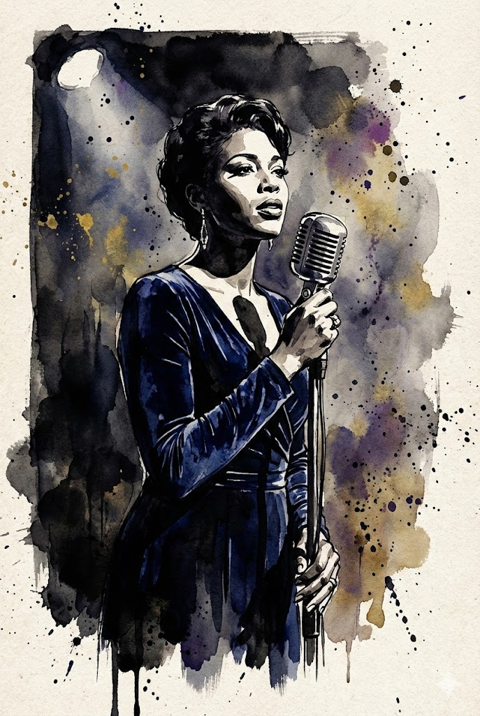 A high-contrast ink noir portrait of a soulful jazz singer lady with a vintage microphone on a smoky stage, wearing a deep blue velvet dress, illustrated entirely in a raw, expressive colored ink wash and controlled splatter style, reminiscent of traditional sumi-e painting meets gritty graphic novel art (think Frank Miller's Sin City aesthetic but in color). Deep, heavy shadows dominate the composition (chiaroscuro lighting), with selective, sharp highlights emerging purely through negative space and white paper. Visible coarse paper grain texture. The atmosphere is moody, cinematic, intense, and dramatic, frozen in time. Rich, saturated color palette with deep ink tones. --ar 2:3