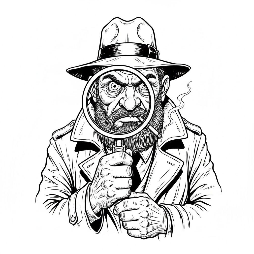 - [A grumpy detective examining a magnifying glass], black and white, comic art style, cartoon, intricate pen and ink drawing, detailed, expressive, exaggerated features, whimsical, classic illustration, high contrast, clean lines, white background, no gradients, no shading, simple background