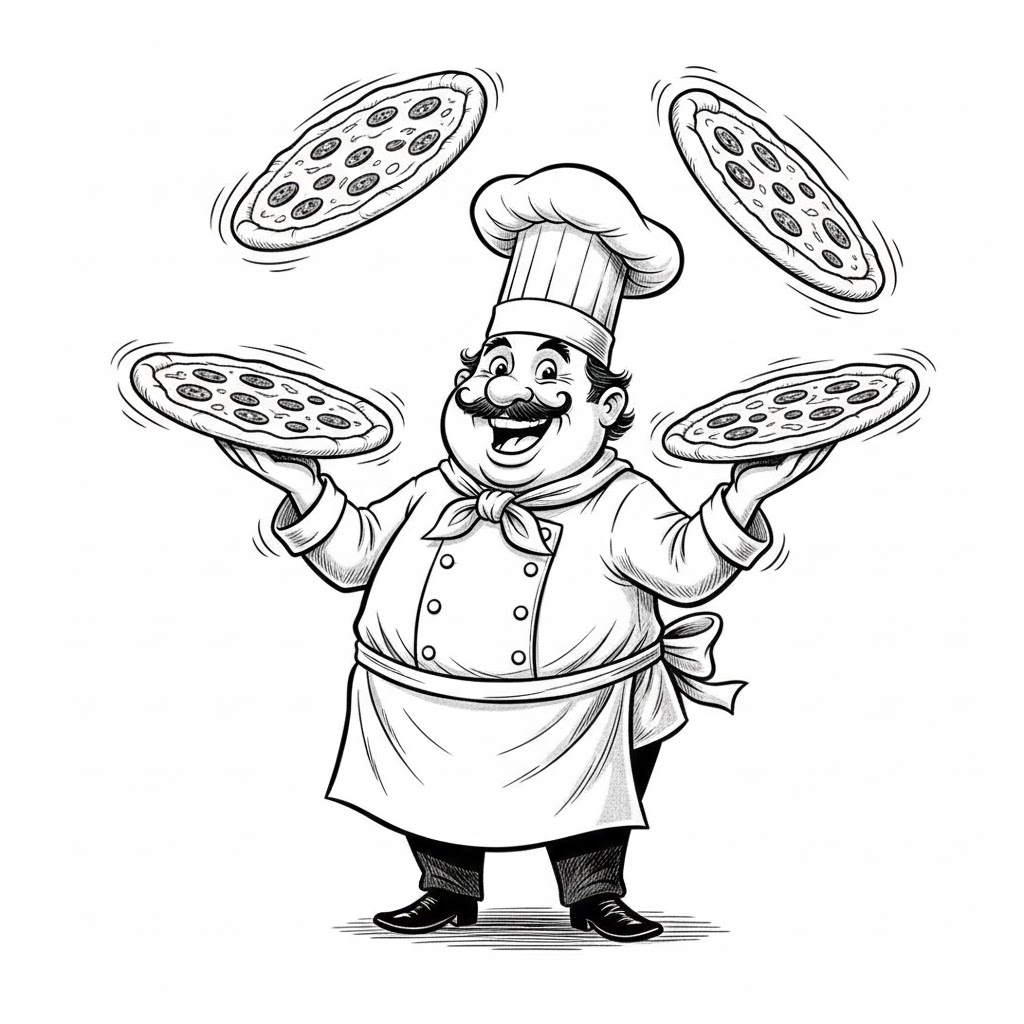 - [A happy chef juggling three pizzas], black and white, comic art style, cartoon, intricate pen and ink drawing, detailed, expressive, exaggerated features, whimsical, classic illustration, high contrast, clean lines, white background, no gradients, no shading, simple background
