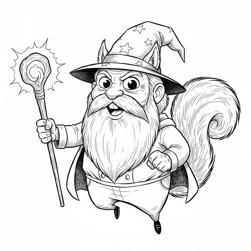- [An old wizard with a long beard holding a glowing staff], black and white, comic art style, cartoon, intricate pen and ink drawing, detailed, expressive, exaggerated features, whimsical, classic illustration, high contrast, clean lines, white background, no gradients, no shading, simple background