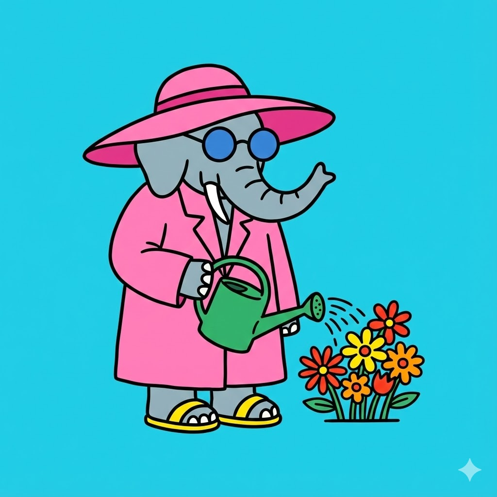 A playful pop art illustration featuring a single anthropomorphic elephant character. The art style is characterized by thick bold black outlines, flat vibrant colors, and a whimsical hand-drawn aesthetic with no shading. The character is wearing a wide-brimmed pink hat, blue round glasses, a long pink coat, and sandals and is watering flowers with a watering can. The character is centered against a solid cyan background. The overall look is clean, iconic, and fashion-forward. --ar 1:1